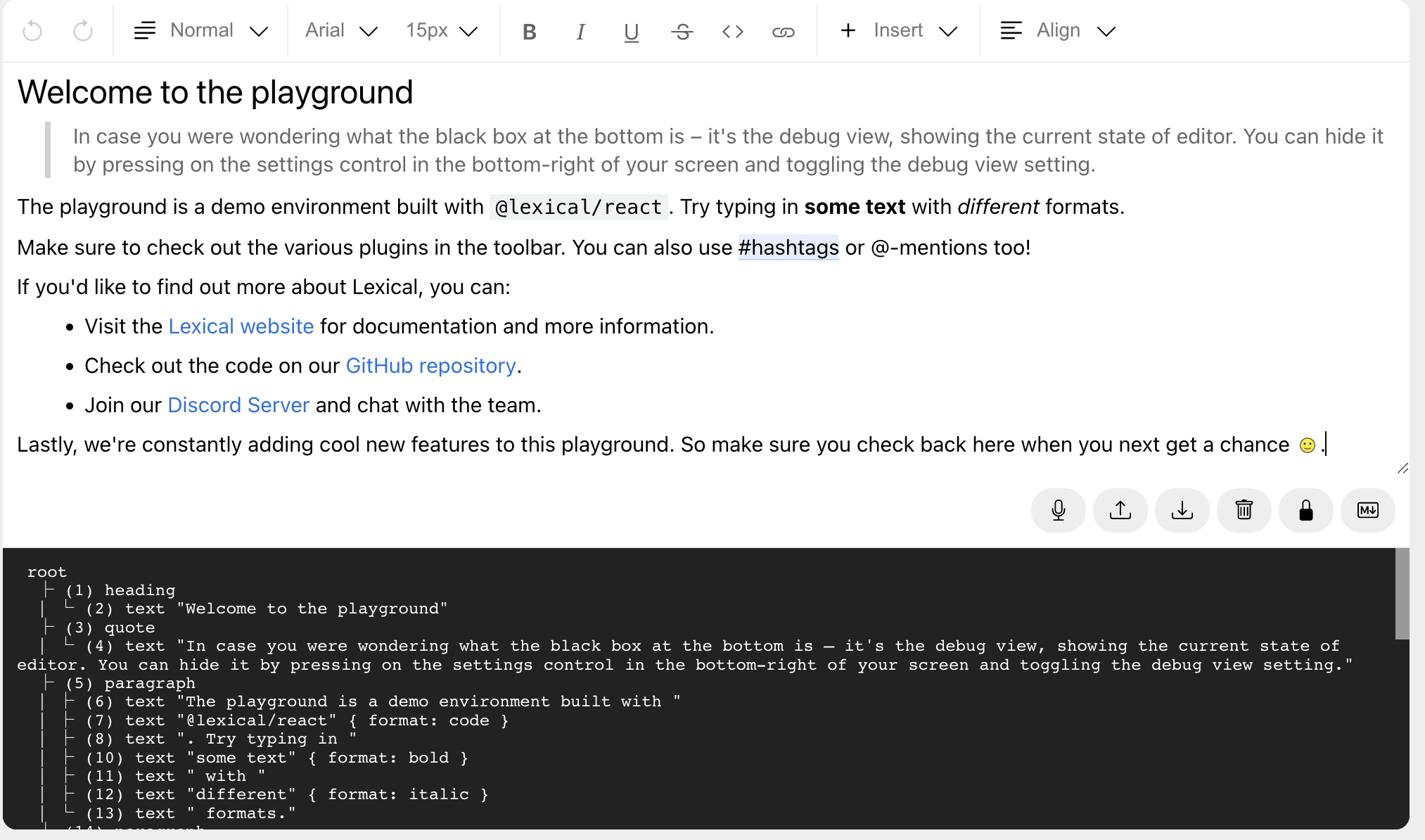 https://lexical.dev/ Facebook刚推的编辑器框架,可以做富文本,也可以做Markdown。截图的下半部分就是富文本的数据结构。